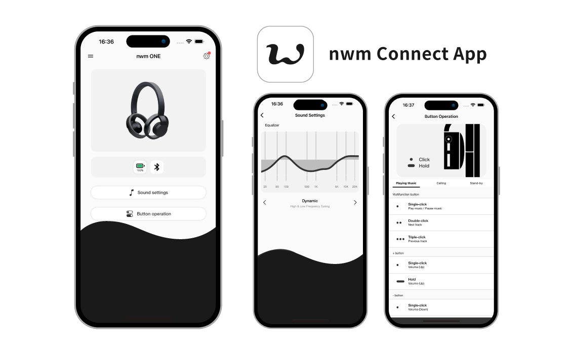 Download the free nwm Connect app (available for iOS and Android) to easily check device status, adjust EQ settings, update firmware, and customize button controls through a simple, user-friendly interface.